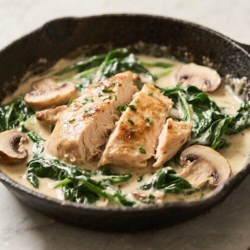 This creamy chicken mushroom spinach skillet is all about comfort made simple. With golden seared chicken, a rich yet balanced sauce, and tender greens, it delivers big flavor without a big effort. Keep it classic, or make it your own with easy swaps and add-ins.