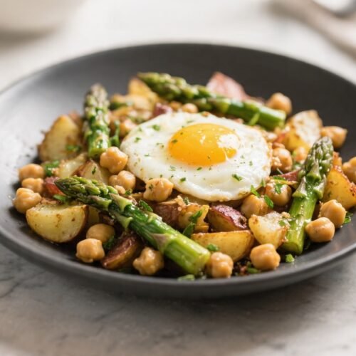 This is the kind of breakfast-for-dinner dish that feels special without asking much of you. Tender potatoes, crisp-tender asparagus, and golden chickpeas form a hearty base, while lemon, herbs, and olive oil bring sunny Mediterranean flavor. A couple of poached eggs on top turn it into a complete, comforting meal.