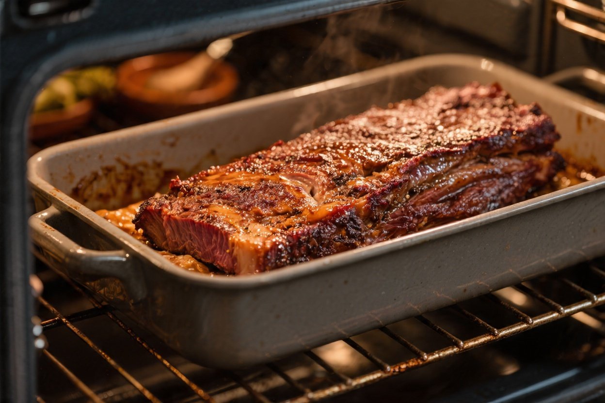This oven method honors classic Texas simplicity: a bold rub and steady heat. The brisket cooks low and slow, allowing tough connective tissue to melt into tender, juicy meat.